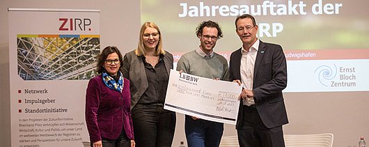 (v.l.n.r.) Heike Arend, Geschäftsführerin der ZIRP, Hannah Taubitz, stv. Netzwerkkoordinatorin ROCK YOUR LIFE! Mainz e.V., Jonas Jähnke, Netzwerkkoordinator ROCK YOUR LIFE! Mainz e.V., Michael Heinz, Vorsitzender der ZIRP und Mitglied des Vorstands der BASF SE
