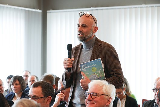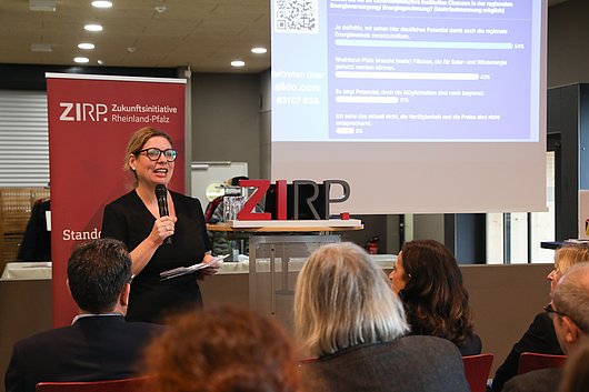 Impulse zur Veranstaltung gaben Carsten Bovenschen, CEO der JUWI-Gruppe, Klimaschutzministerin Katrin Eder und Prof. Dr. Henrik te Heesen, Vizepräsident für Forschung der Hochschule Trier und Studiengangsleiter „Erneuerbare Energien“ am Umwelt-Campus Birkenfeld. Moderiert wurde die Veranstaltung von Angelika Hensolt (SWR).