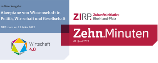 Rheinland-Pfalz ist ein wichtiger Wissenschaftsstandort, dies wird mit der Entwicklung des mRNA-Impfstoffes zurzeit weltweit deutlich. Teile der Gesellschaft zeigen sich zugleich als Wissenschafts-Skeptiker. So wichtig der öffentliche Diskurs für die Akzeptanz wissenschaftlicher Erkenntnisse ist: Wissenschaft braucht Grundvertrauen! Daher lud die ZIRP am 22. März 2022 wieder zu einer digitalen Veranstaltung im Rahmen des Formats ZIRPzoom – Perspektiven der Wirtschaft in Rheinland-Pfalz ein zum Thema „Akzeptanz der Wissenschaft in Politik, Wirtschaft und Gesellschaft“.