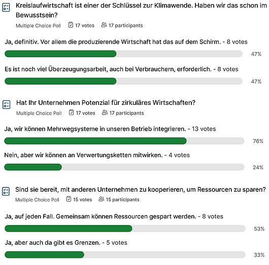 Der Großteil der Befragten sieht für ihre Betriebe und Unternehmen Potenzial für zirkuläres Wirtschaften und Kooperationen, die dieses fördern. Uneinig sind sich die Befragten in Bezug auf die benötigte Überzeugungsarbeit. Während etwa die Hälfte einschätzt, dass die produzierende Wirtschafts das Prinzip der Kreislaufwirtschaft als einen Schlüssel zur Klimawende anerkannt hat, erwägt die andere Hälfte, dass insbesondere die Verbraucherinnen und Verbraucher noch noch von dem Prinzip der Kreislaufwirtschaft überzeugt werden müssen.