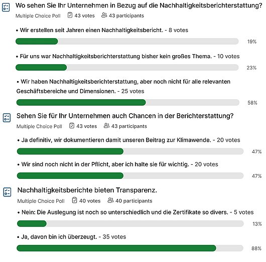 Der Großteil der Teilnehmenden ist der Überzeugung, dass Nachhaltigkeitsberichte Transparenz bieten. Während alle Teilnehmenden der Befragung die Berichterstattung für wichtig erachten, dokumentiert nur eine Hälfte ihren Beitrag zur Klimawende. Die andere Hälfte ist noch nicht in der Pflicht. Viele weitere führen schon Nachhaltigkeitsberichterstattung, aber noch nicht in allen relevanten Bereichen.