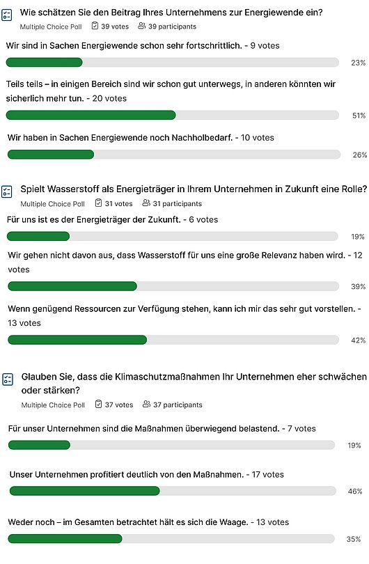 Die Einschätzungen der Befragten divergieren tendenziell voneinander. Drei Viertel der Befragten stufen ihren eigenen Beitag zur Energiewende als sehr fortschrittlich ein oder räumen ein, dass weiterhin noch Ausbaubedarf besteht. In Bezug auf die Rolle von Wasserstoff als Energieträger der Zukunft sind die Befragten nicht mehrheitlich einer Meinung. Die Hälfte der Teilnehmenden profitiert nach eigenen Angaben deutlich von Klimaschutzmaßnahmen.